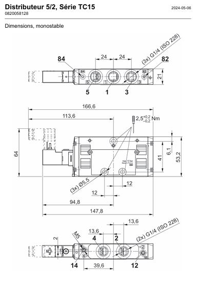 Secteur: Industrie Commande: électrique Remarque: Tension de service 24 V AC, 110 V AC, 230 V AC Type de construction du distributeur: Distributeur à tiroir chevauchement positif Elément de commande: Monostable Principe d’étanchéité: à étanchéification souple Type de raccordement: Raccordement direct Commande manuelle: Sans crantage Entrée raccord d’air comprimé: G 1/4 Sortie raccord d’air comprimé: G 1/4 Raccord d’air comprimé échappement: G 1/4 Débit nominal Qn: 1500 l/min Conductance de débit b: 0.33 Conductance de débit C: 6.8 l/(s*bar) |